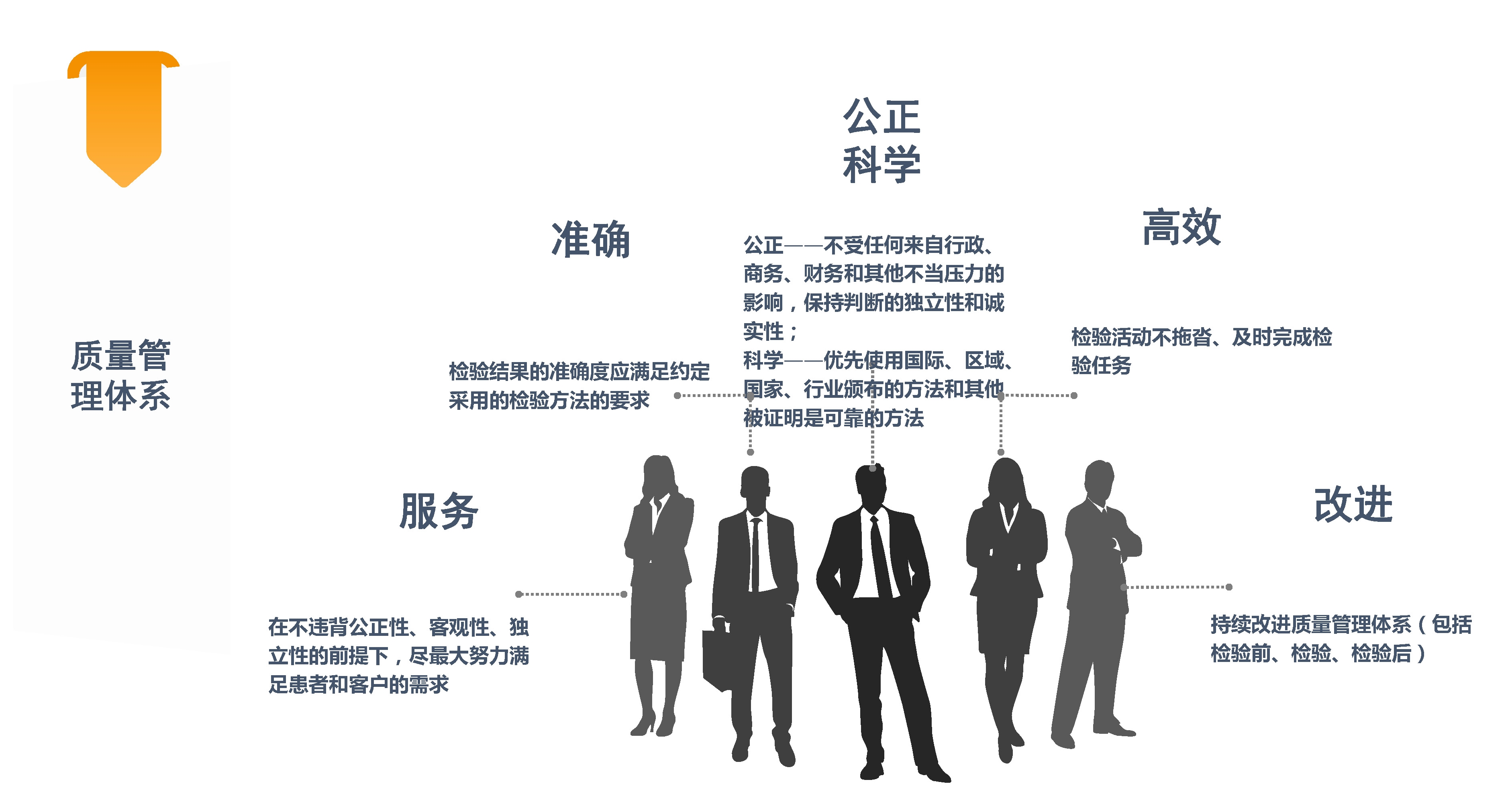 秉承“公正、科学、准确、高效、服务、改进”的质量方针